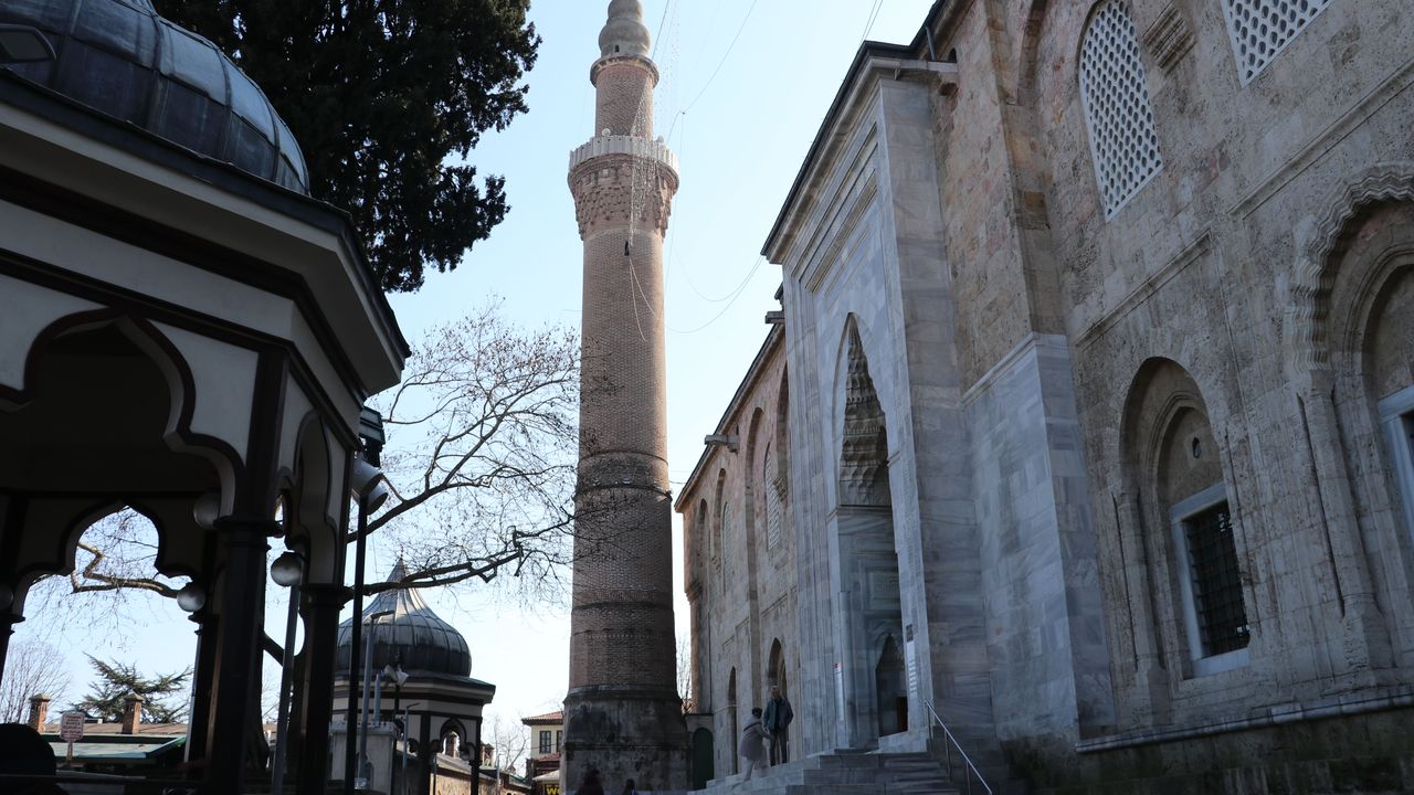 Tarihi Ulu Cami'ye Kültür ve Turizm Bakanlığı Bursa Vakıflar Bölge Müdürlüğü koordinasyonunda Osmanlı'nın son mahyacısı Hacı Ali Ceyhan'ın çırağı Kahraman Yıldız'ın başında olduğu ekip tarafından hazırlanan mahya asılıyor.