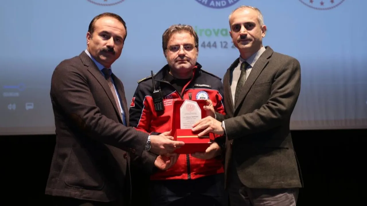 Konuşmaların sonrasında Çayırova Belediye Başkanı Bünyamin Çiftçi ve Çayırova İlçe Milli Eğitim Müdürü Recep Demir, afet farkındalık eğitimlerini gerçekleştiren ÇAK-TİM Lideri Hüseyin Narman’a plaket takdim etti.