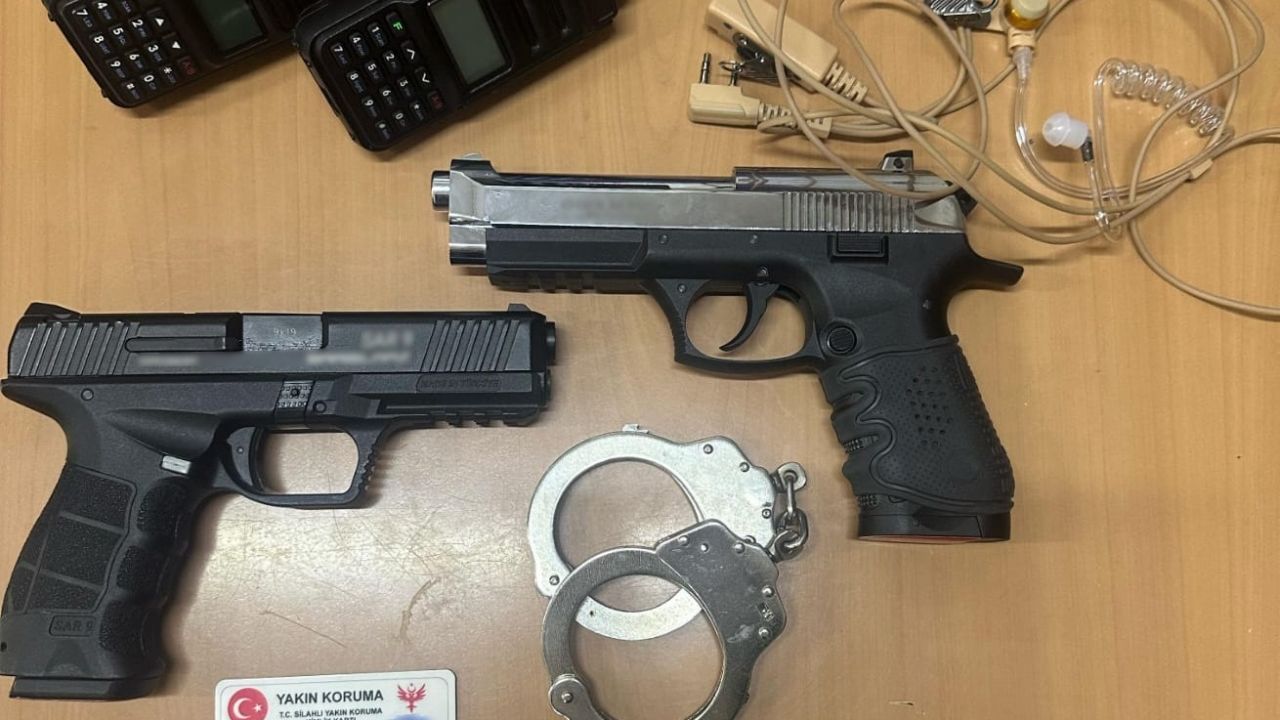 Polis ekiplerince muhafaza altına alınan D.İ. (19) ve S.E (25) isimli şüphelilerin üst aramasında 2 havalı tabanca, 2 telsiz ve telsizlere bağlı kulaklık, kelepçe, polis ve koruma rozeti bulunan 2 cüzdan, üzerinde yakın koruma yazılı 2 kimlik kartı ele geçirildi.