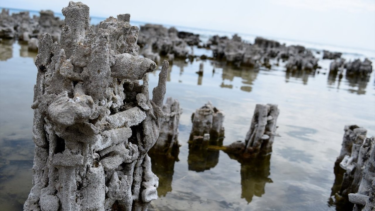 Yağışların azalması ve kuraklık nedeniyle gölün kıyılarında yaşanan çekilme sonucu ortaya çıkan mikrobiyalitler de görüntülendi.