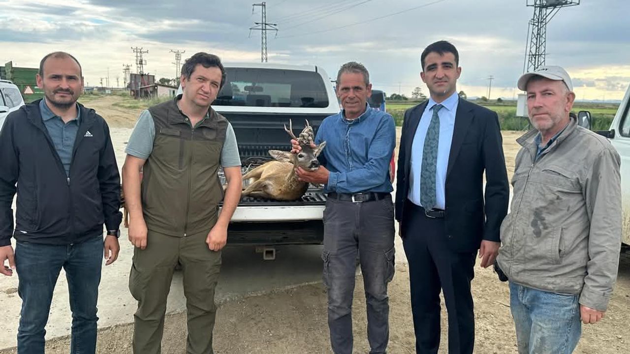 İpsala Ovası'nda su kanalına bir karacanın düştüğünü gören çeltik işçileri, hayvanı kurtarmak için harekete geçti.