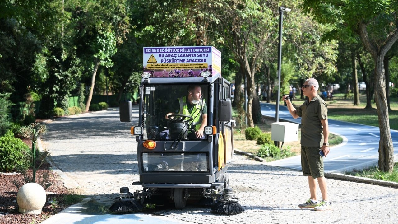 EDİRNE (AA) - Edirne'de Söğütlük Millet Bahçesi'ne gelenler, lavanta suyu püskürten araçlar yardımıyla serinliyor.