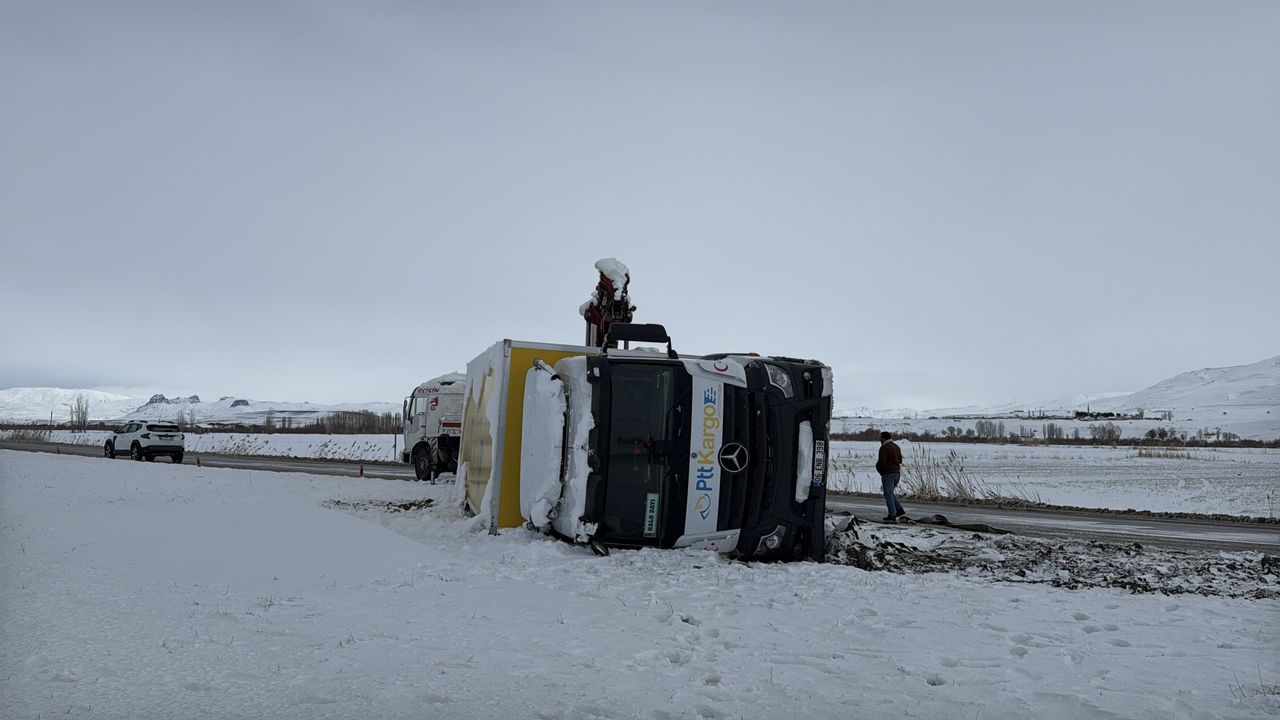 Kar yağışı ve tipi nedeniyle bazı araçlar yolda kaldı, Tercan-Aşkale kara yolunda bir kamyonet yoldan çıkarak devrildi.
