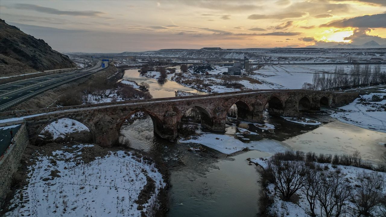 Dondurucu soğukların hüküm sürdüğü bölgede, kesme taştan inşa edilen köprünün kemerleri kar örtüsüyle kaplandı, altından geçen dere ise kısmen buz tuttu.