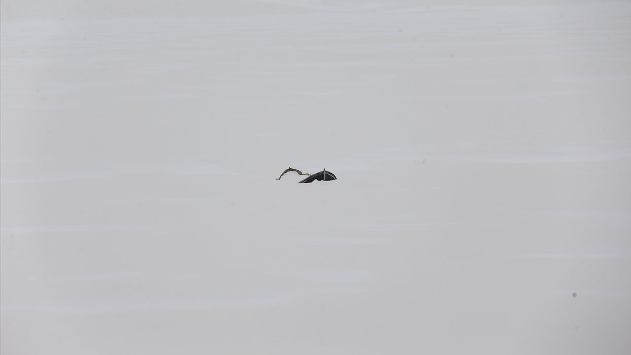Ortasındaki kayığın kar altında kaldığı yüzeyi buzla kaplı gölet, dronla görüntülendi.