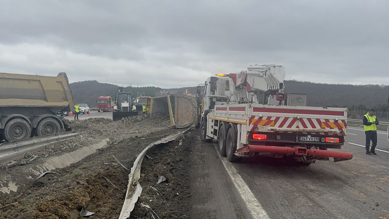 Kuzey Marmara Otoyolu'nun Işıklar mevkisinde, İstanbul Havalimanı istikametinde seyreden 34 ZR 7570 plakalı hafriyat kamyonu devrildi.