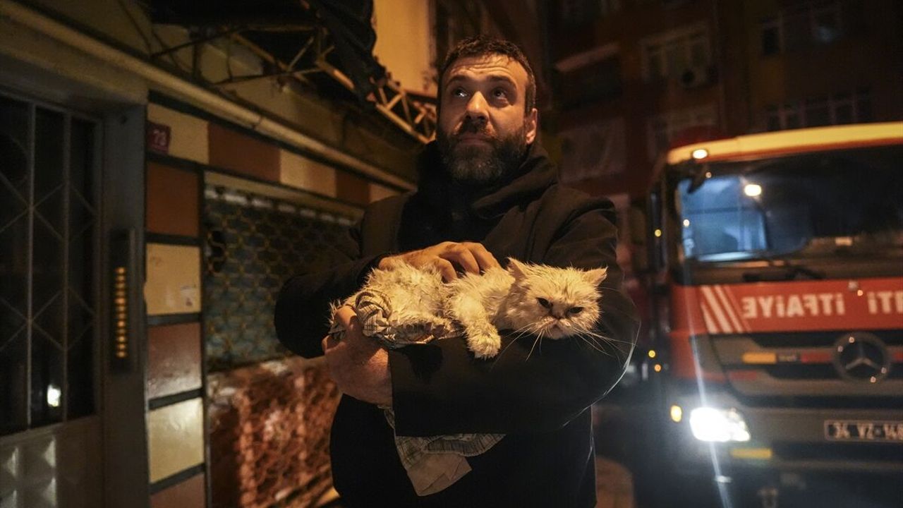 Ahşap binadan itfaiye ekiplerince çıkarılan ve halsiz olduğu görülen bir kediye ambulansta sağlık ekiplerince oksijen maskesi takılarak kendine gelmesi sağlandı.