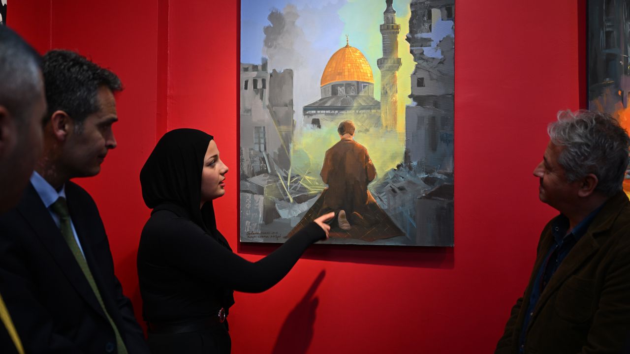 Gazze'deki dramın yansıtıldığı 26 eser, okulun sergi salonunda sanat severlerle buluştu.