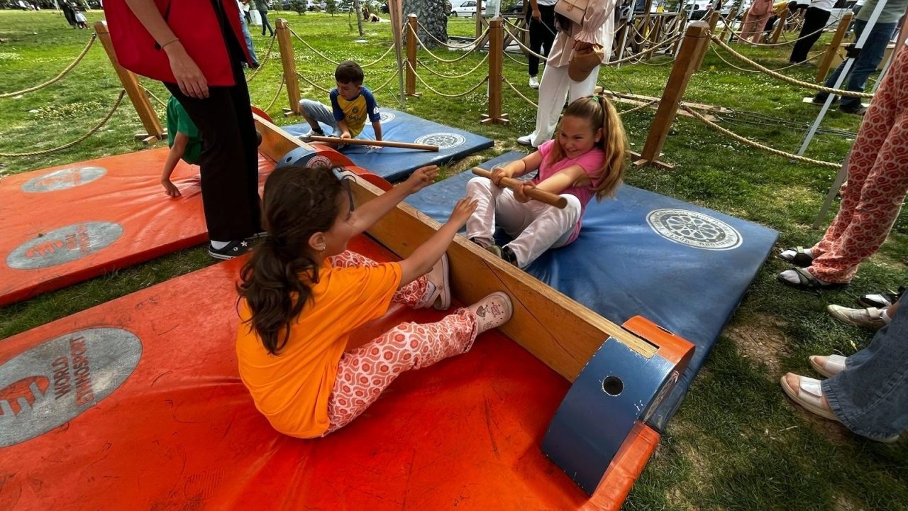 Parkurda yer alan halat çekme, koca ayak, mangala, çember çevirme ve masa güreşi gibi oyunları deneyimleyen çocuklar doyasıya eğlendi.