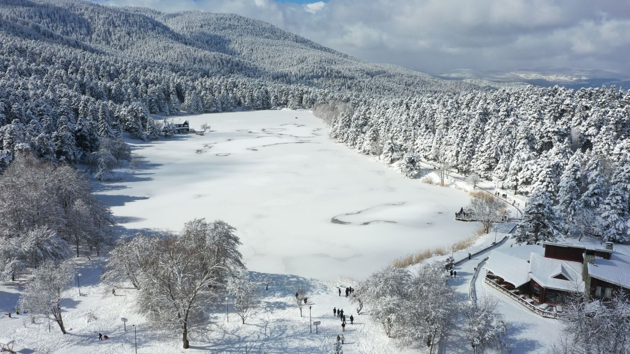 Gölcük Tabiat Parkı'nın karlı manzarası dron ile havadan görüntülendi.
