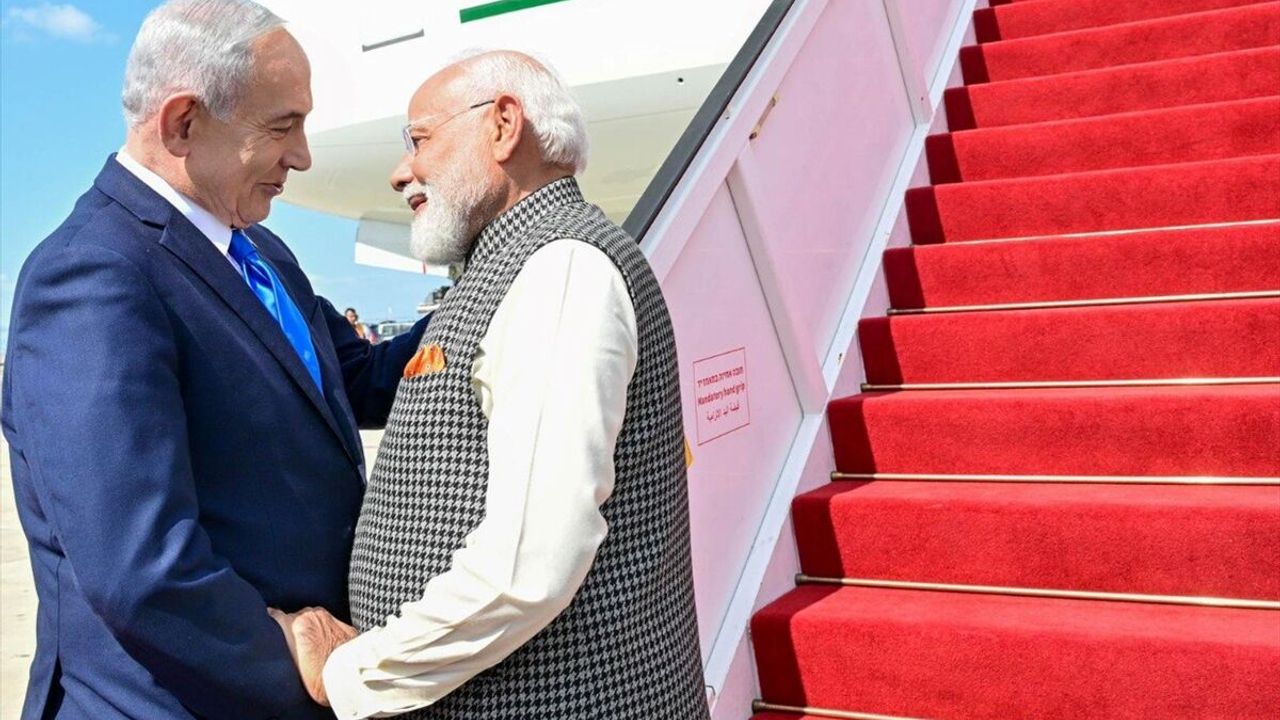 Netanyahu'nun uçaktan inen Hindistanlı mevkidaşını, 'Hoş geldin dostum. Burada olmanız harika. Konuşacak çok şeyimiz var.' ifadeleriyle karşıladığı görüldü.