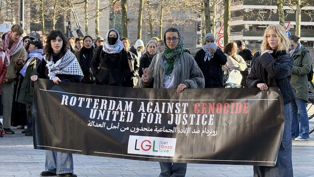 Rotterdam merkez tren istasyonunun önünde yerel saatle 16.00'da (TSİ 18.00) toplanan göstericiler, İsrail'in saldırganlığını ve ateşkesi bozmasını, soykırım suçunun devamı olarak nitelendirdi.