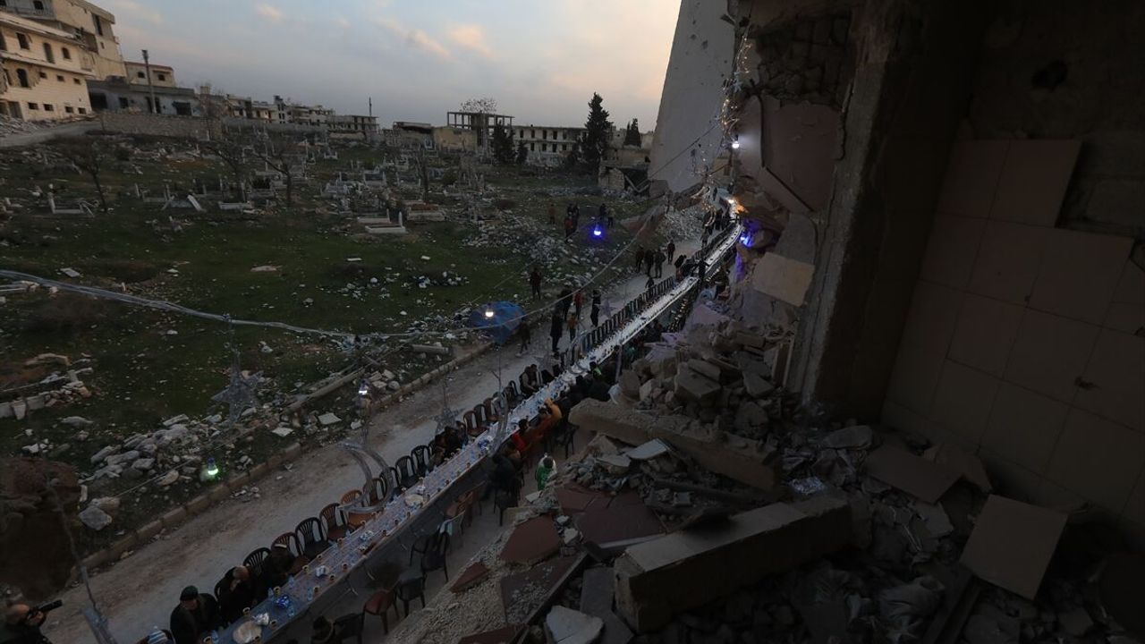 HALEP (AA) - İnsan Hak ve Hürriyetleri (İHH) İnsani Yardım Vakfı, Suriye'nin Halep vilayetinin Kefer Hamra köyünde devrik Baas rejimi ve destekçilerinin saldırılarında enkaz haline gelen evlerin arasında toplu iftar programı düzenledi.