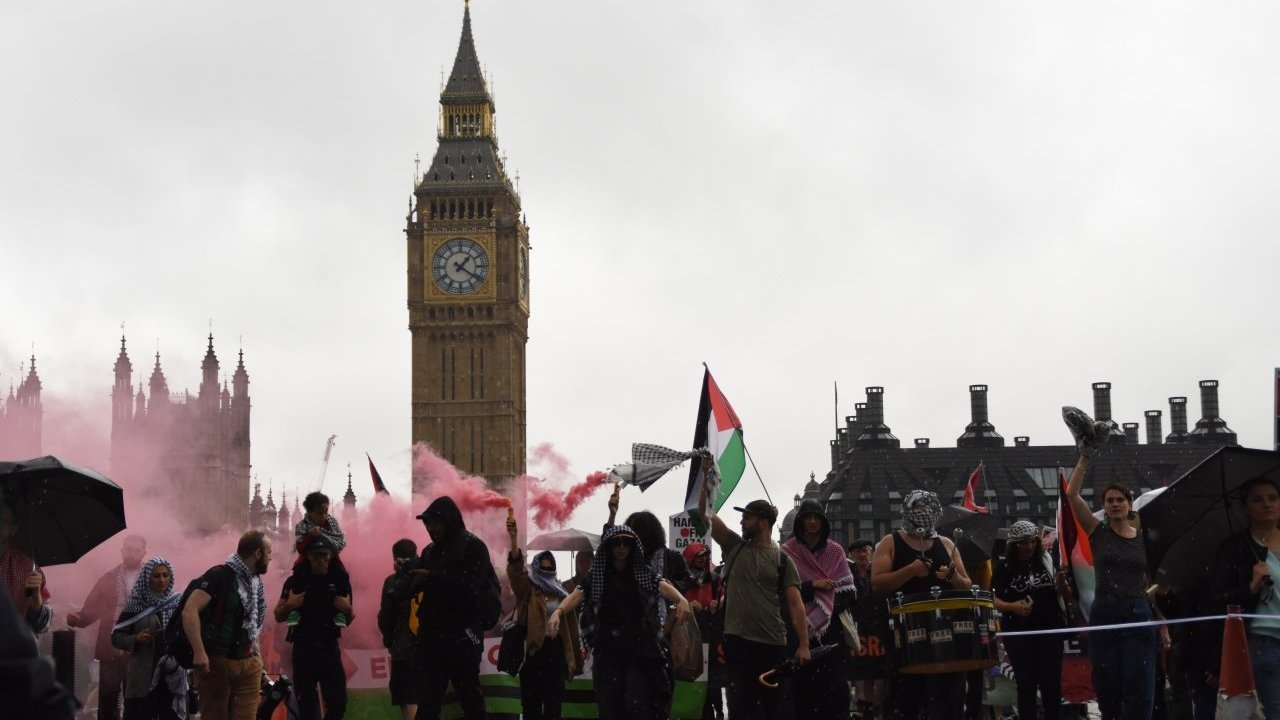 Londra'daki Embankment istasyonu önünde toplanan on binlerce Filistin destekçisi, İsrail'in Gazze saldırılarına, İngiltere'nin İsrail'e silah satışlarına ve İngiltere'de Filistin destekçilerine yönelik baskılara tepki göstermek için yürüdü.