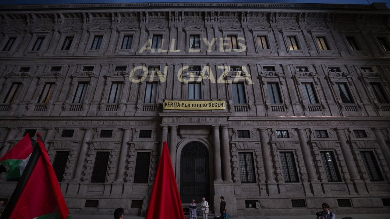 Milano Belediye binası olan Marino Sarayı'nın ön cephesine akşam saatlerinde "Tüm gözler Gazze'de" yazısı yansıtılarak, Gazze'de yaşananlara dikkat çekildi.