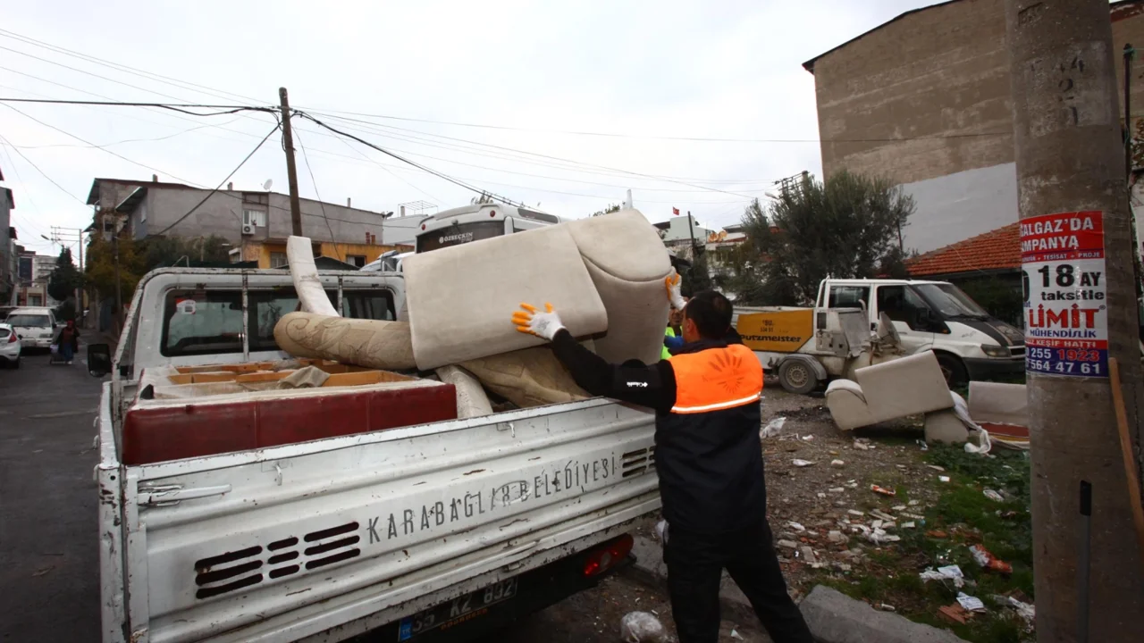 Belediye ekipleri Karabağlar’da günde ortalama 12-14 kamyonet dolusu mobilya atığı topluyor. Bu yoğunluğa rağmen hizmetin aksamadan devam edebilmesi için planlı çalışmanın ve vatandaş işbirliğinin önemi vurgulandı.