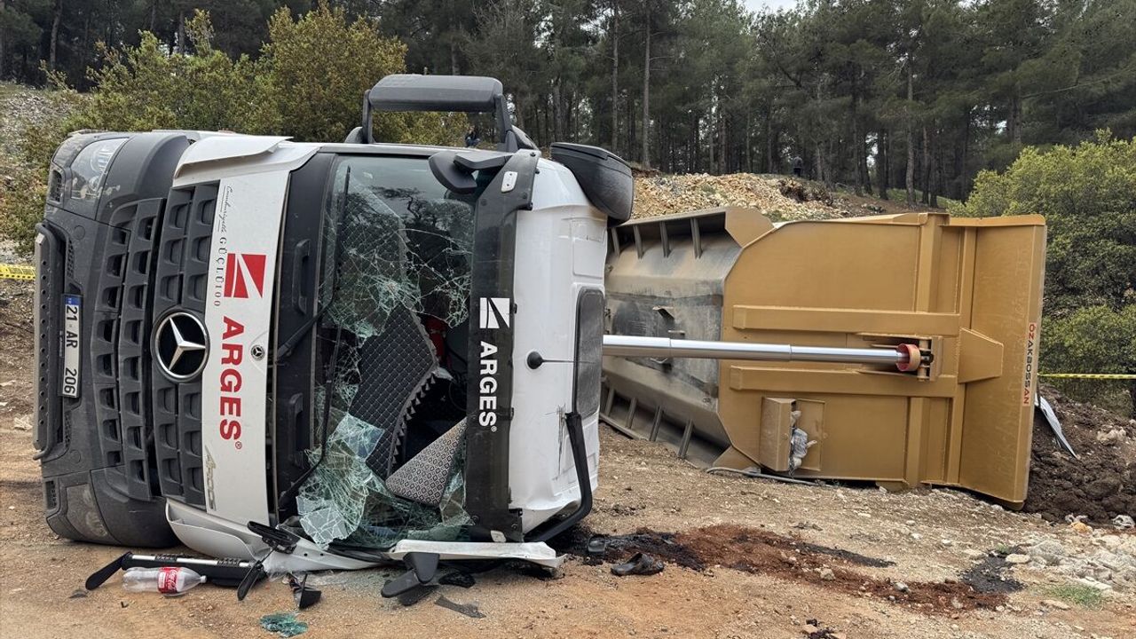 Mehmet Önal yönetimindeki 21 AR 206 plakalı hafriyat kamyonu, Yeşiltepe Mahallesi'nde bulunan döküm sahasında devrildi.