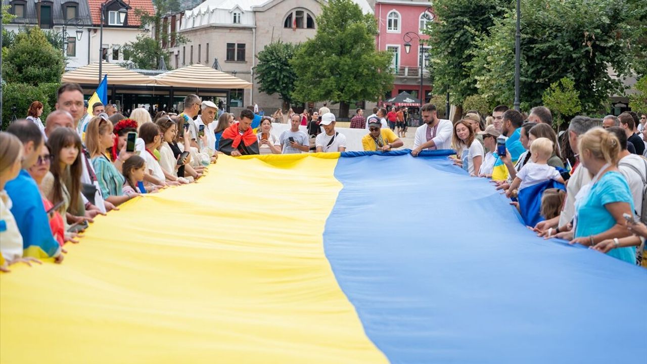 Ukrayna'nın Podgoritsa Büyükelçiliği işbirliğinde Karadağ'daki Ukrayna Birliği tarafından düzenlenen etkinliğe katılan kalabalık, 34 metre uzunluğundaki Ukrayna bayrağıyla kent sokaklarında yürüdü.