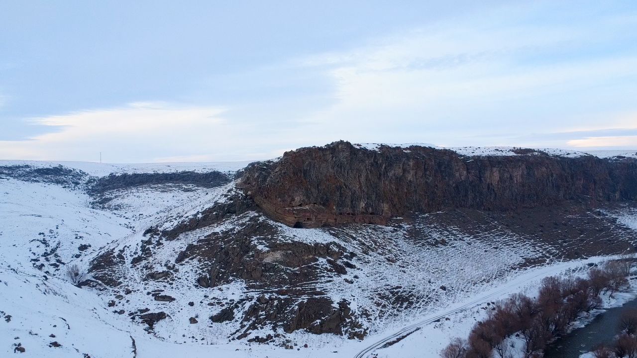 KARS (AA) - Kars'ta etrafı karla kaplanan Akyaka Kanyonu dronla görüntülendi.