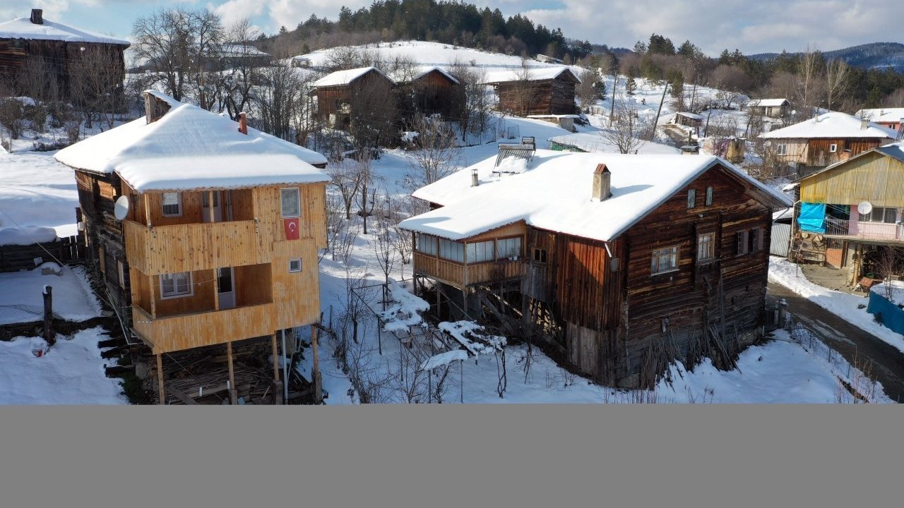 Bölgenin ahşap kültürünü yansıtan evler, kar yağışı ile dikkat çekici bir görüntüye kavuştu. Evler dron ile görüntülendi.
