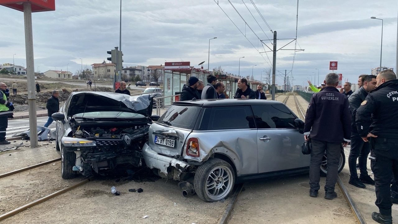 Çarpışmanın etkisiyle savrulan araçlar, tramvay yoluna girdi.