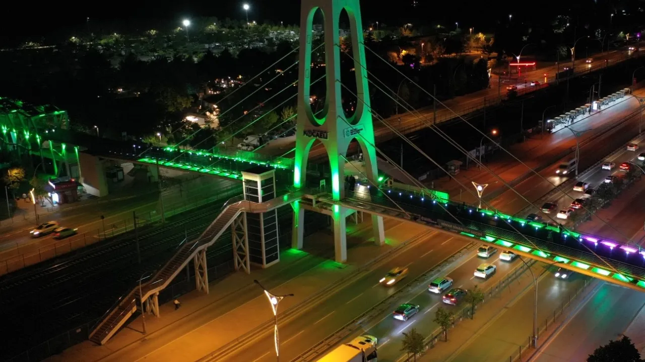 Kocaeli Büyükşehir Belediyesi ekipleri, şampiyon Kocaelispor için kentte bulunan tüm üst geçitlerin ışıklandırmalarını yeşil renk yaptı.KOCAELİ (İGFA) - Dev Kocaelispor bayrağını Osmangazi Köprüsü’ne ve İstanbul Boğazı’na asarak Süper Lig coşkusunu taçlandıran Büyükşehir Belediyesi, şehrin sembol yapılarından olan üst geçitleri de yeşil renkle aydınlattı.