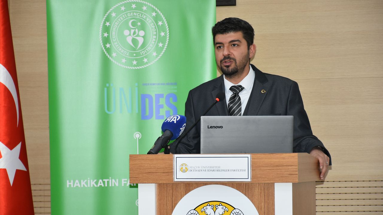 Cumhurbaşkanlığı İletişim Başkanlığı Dezenformasyonla Mücadele Merkezi İletişim Uzmanı İhsan Çetin, Selçuk Üniversitesi İktisadi ve İdari Bilimler Fakültesi Prof. Dr. Şahabettin Yiğitbaşı Konferans Salonu'nda düzenlenen programda, haber almanın ya da habere ulaşmanın insanın yaratıldığı ilk andan itibaren en temel hak ve özgürlüğü olduğunu söyledi.