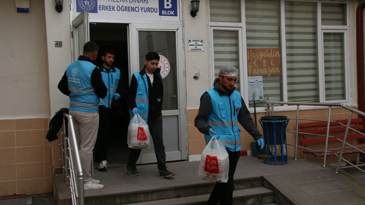 Gönüllülük esasıyla yürütülen çalışmada öğrenciler, yurt mutfaklarında hazırlanan sıcak yemekleri paketleyerek ihtiyaç sahiplerinin iftar sofralarına ulaştırıyor.