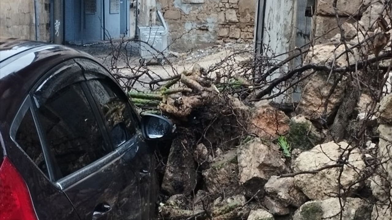 Yıkılan duvar, park halindeki 31 ET 061 plakalı otomobilde hasar oluşturdu.