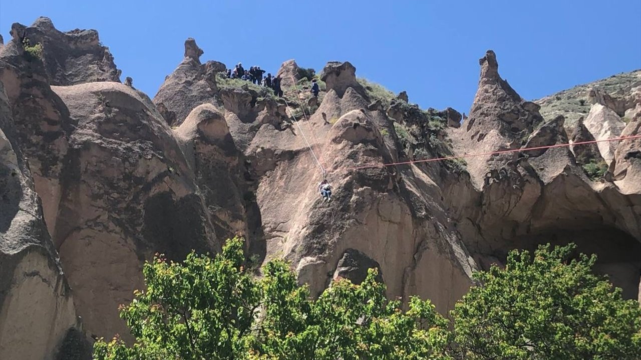 Öte yandan, AFAD ve itfaiye ekipleri, bir peribacasının yamacında mahsur kalan turistleri halat yardımıyla indirdi.