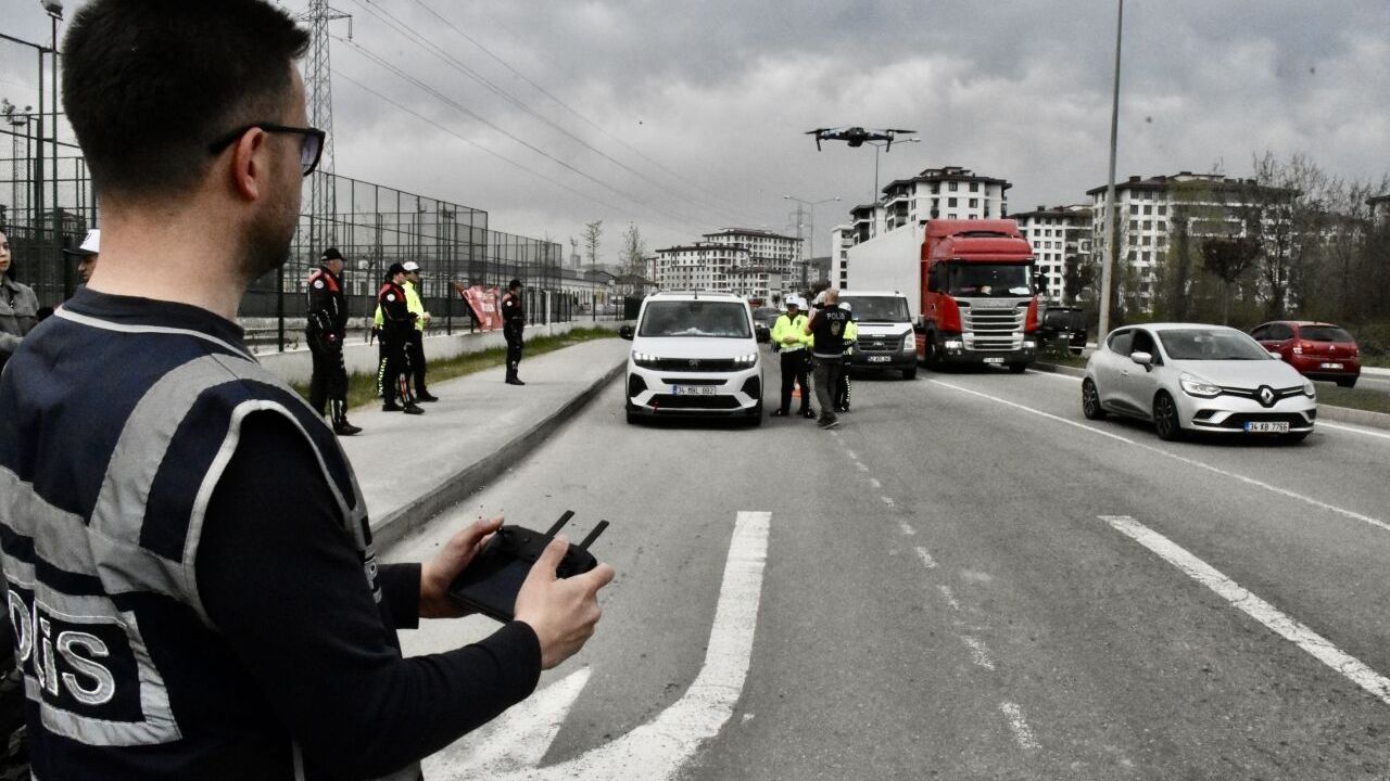 Trafikteki araçları dronla da izleyen ekipler, sürücülerin kurallara uyup uymadığını hem havadan hem de karadan takip etti.