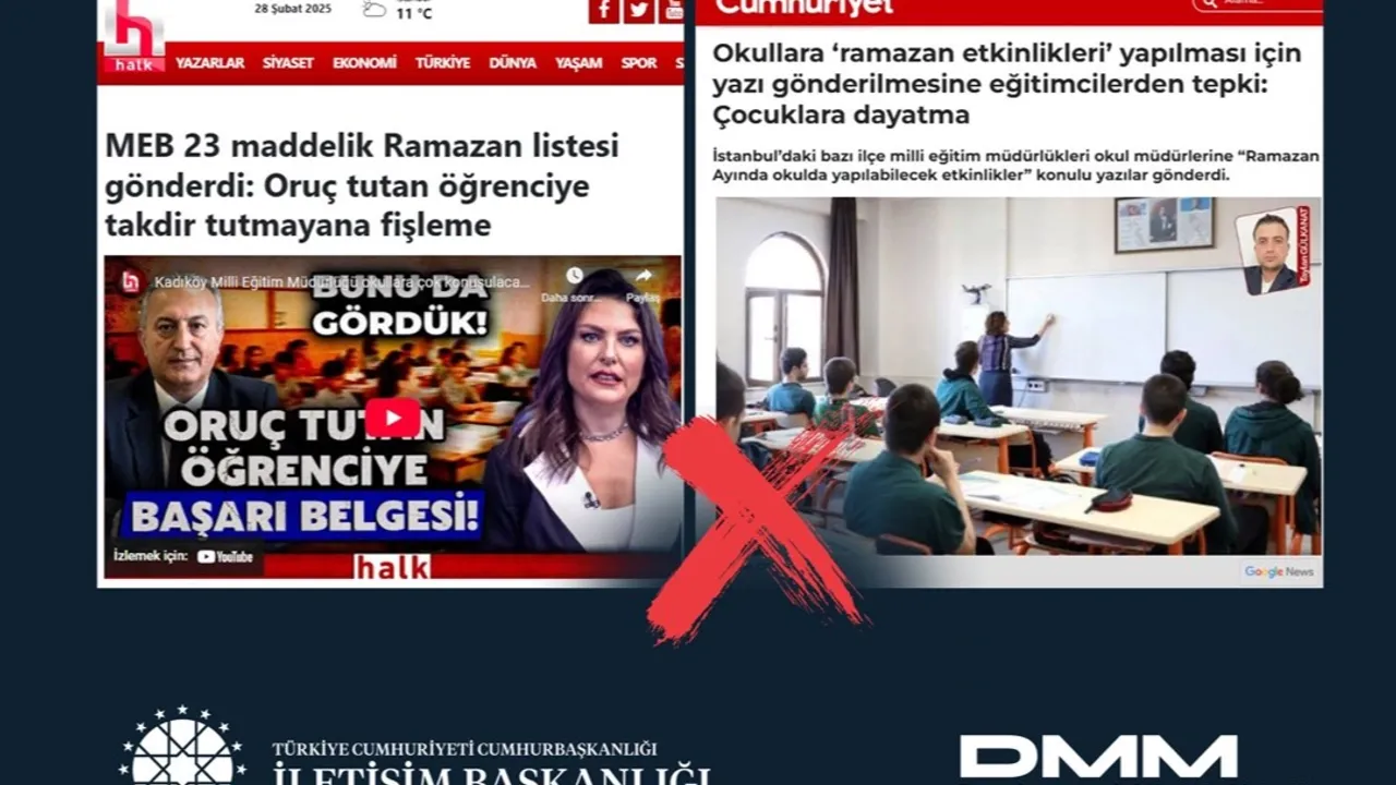 Dezenformasyonla Mücadele Merkezi'nden yapılan açıklamada, bazı basın yayın organlarında, “Millî Eğitim Bakanlığı tarafından oruç tutan öğrenciye takdir, tutmayana fişleme” iddiasıyla servis edilen haberler manipülasyon içerdiği belirtildi.