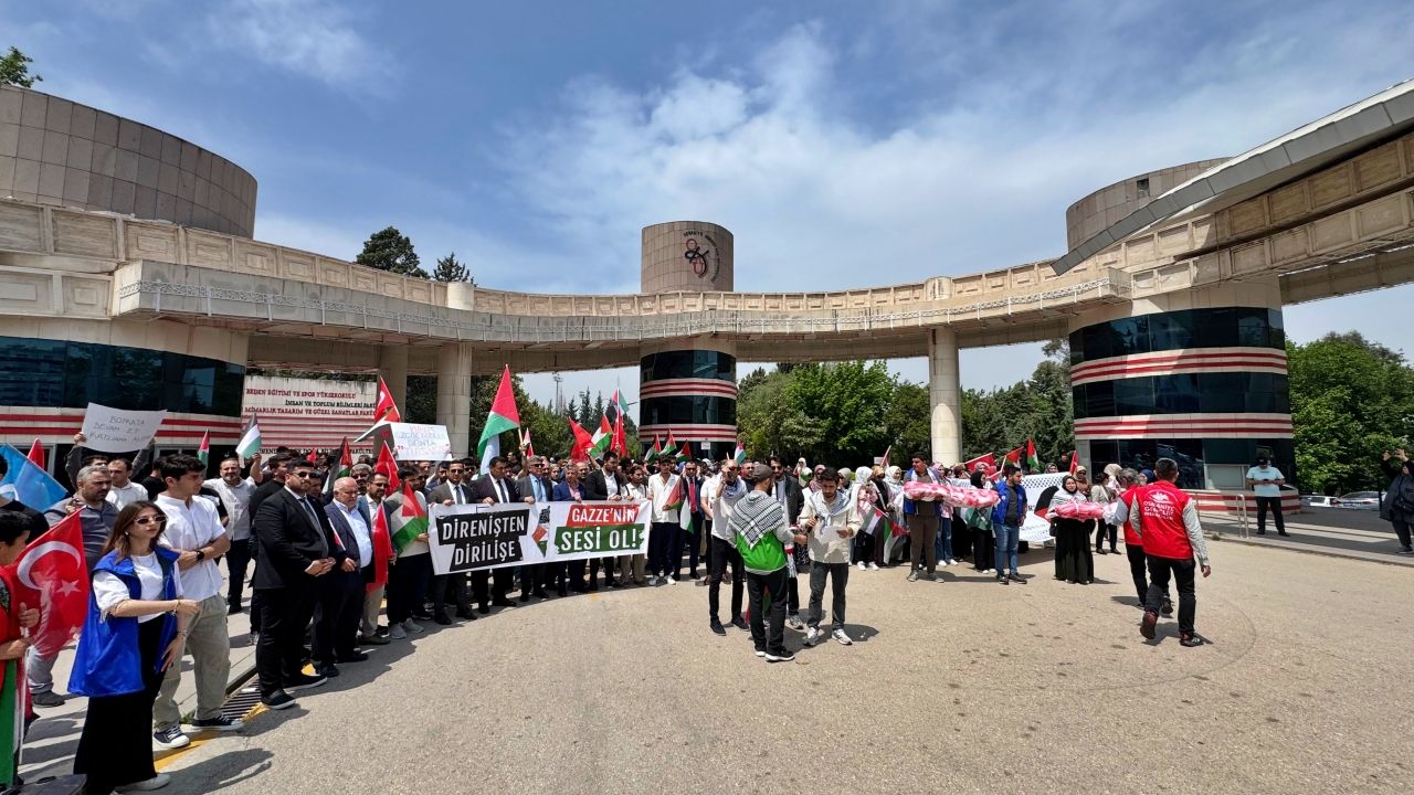 Üniversite öğrenci gruplarının öncülüğünde yerleşkedeki kütüphane önünde toplananlar, ellerinde Türk ve Filistin bayraklarıyla slogan atarak üniversitenin girişine kadar yürüdü.