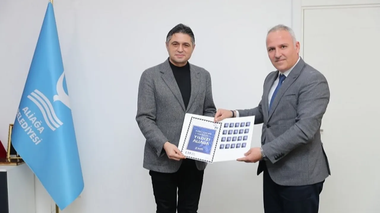 İzmir PTT Başmüdür Yardımcısı Özgür Babalı, Aliağa Belediye Başkanı Serkan Acar’ı makamında ziyaret ederek üzerinde “Kuzey Egenin Yükselen Yıldızı Aliağa” ibaresi ve Aliağa görüntüsünün yer aldığı pulları takdim etti. Yapılan ziyarette Aliağa Belediyesi Personel Şirketi Yönetim Kurulu Üyesi Mehmedali Özkurt, Aliağa PTT İlçe Müdürü Barış Taş, İzmir PTT Değerli Kâğıtlar Müdürü Hatice Tahta ve Aliağa Değerli Kâğıtlar Sorumlusu Serhan Öcalan da hazır bulundu.