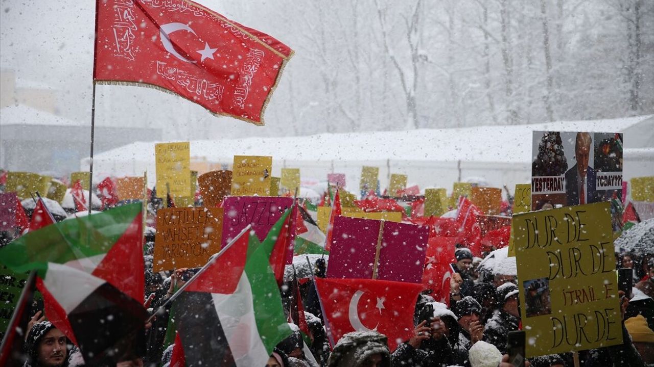 Ardından katılımcılar, ellerinde taşıdıkları Türk ve Filistin bayrakları ile dövizlerle kar altında mitingin düzenleneceği alana yürüdü.