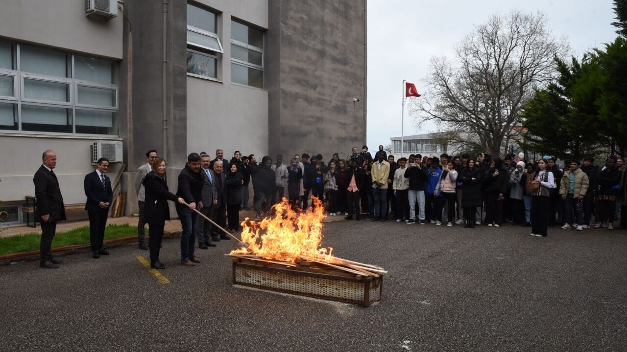 Nevruz ateşinin üzerinden atlayan yöneticiler ve öğrenciler, yeni günlere dair umutlarını paylaştı.