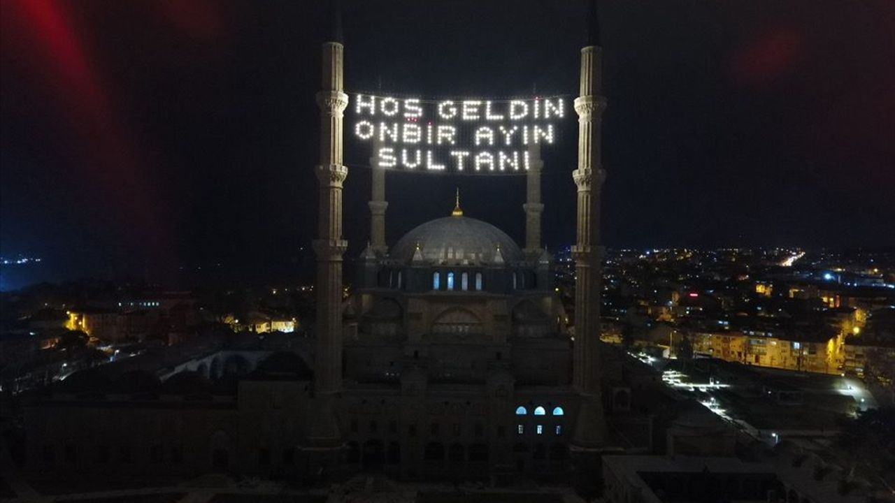 EDİRNE (AA) - Mimar Sinan'ın ustalık eseri Selimiye Camisi minarelerine takılan "Hoş geldin on bir ayın sultanı" yazılı mahya ışıklandırıldı.