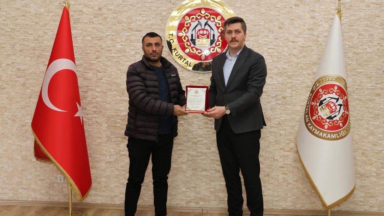 Kurtalan Kaymakamı Samet Serin, makamında kabul ettiği nakliye firmalarının yetkilileri Takyeddin Gülmez ve Ebubekir Mikyas'a teşekkür plaketi verdi.
