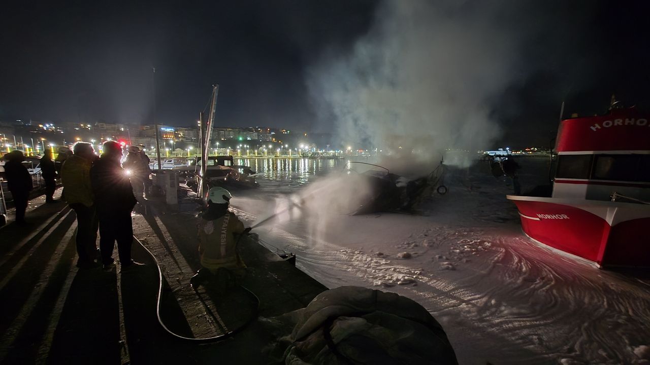 Çavuş Mahallesi Liman Sokak'taki limanda demirli halde bulunan özel bir yatta henüz bilinmeyen bir nedenle meydana gelen patlamanın ardından yangın çıktı.