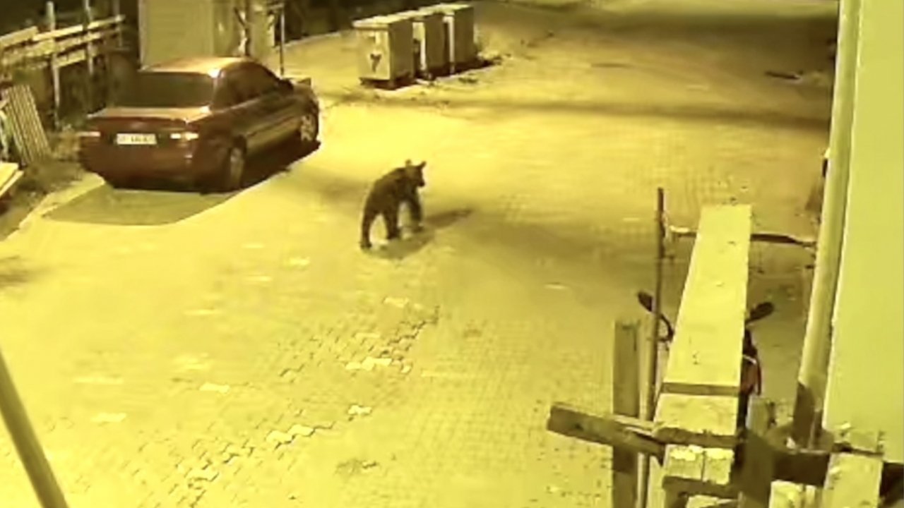Gece saatlerinde ormanlık alandan Güzelkent Mahallesi'ne inen ayı, mahalledeki bir apartmanın güvenlik kamerasınca kaydedildi.