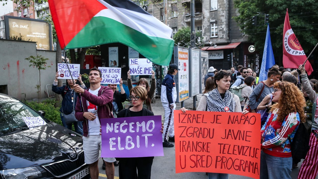 Belgrad'daki Sırbistan Radyo ve Televizyon (RTS) binasının önünde toplanan grup, Sırbistan'ın Eurovision Şarkı Yarışması'na katılmasının İsrail'in işlediği suçlara destek anlamına geldiğine dikkati çekti.