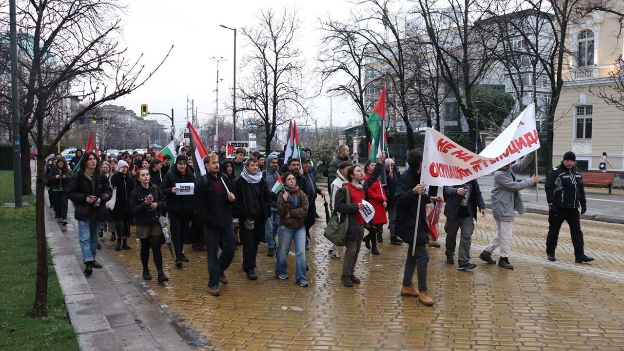 Eylemde, Sofya Üniversitesinden Avrupa Komisyonu Temsilciliği önüne kadar yürüyüş yapan göstericiler, 'Filistin'e özgürlük', 'Terörist İsrail', 'AB, soykırımı destekliyorsun' sloganları attı.