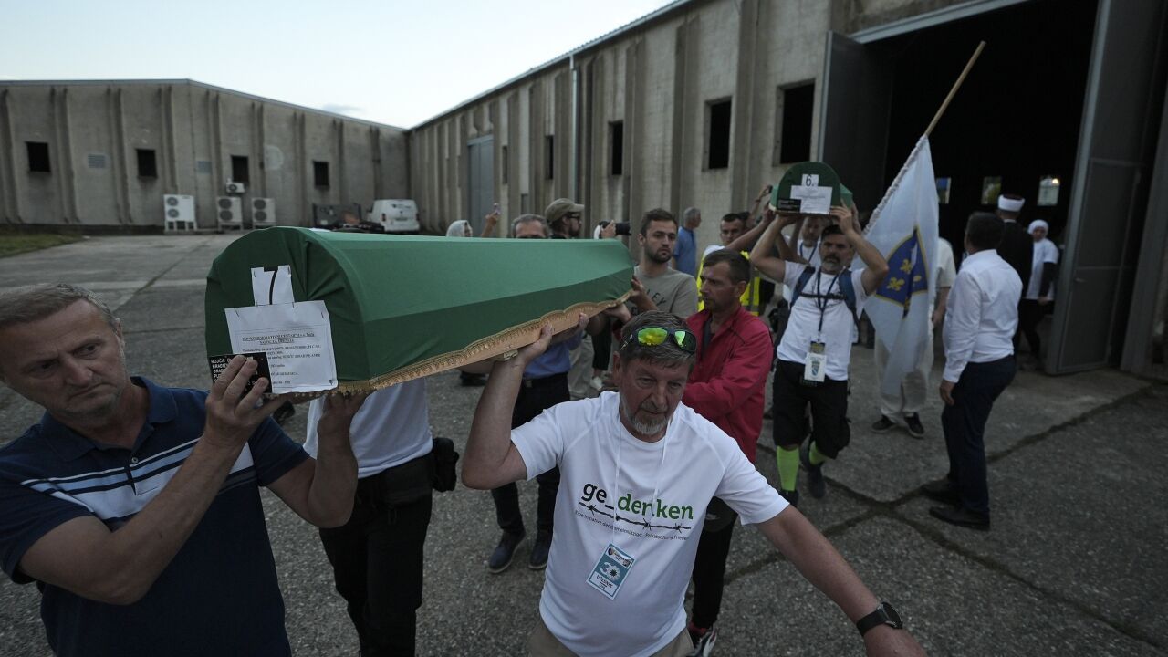 Sırp güçlerince en az 8 bin 372 Boşnak sivilin öldürüldüğü soykırımın 30'uncu yıl dönümünde toprağa verilecek kurbanların cenazeleri, savaşta Birleşmiş Milletler (BM) askerlerinin üs olarak kullandığı eski akümülatör fabrikasından omuzlar üzerinde çıkarılarak mezarlığa getirildi.