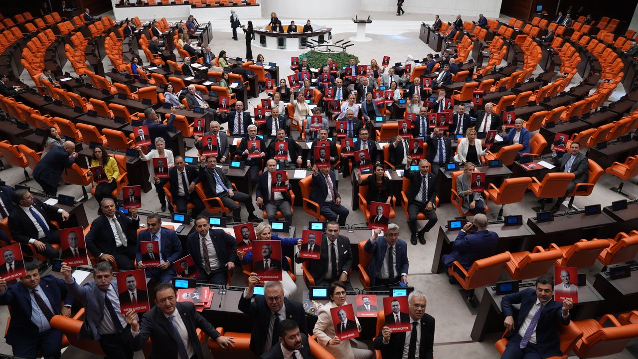 Başarır'ın konuşmasını tamamlamasının ardından CHP sıralarındaki milletvekilleri, haklarında soruşturma yürütülen bazı belediye başkanlarının fotoğraflarıyla "Hak, hukuk, adalet" sloganları attı.