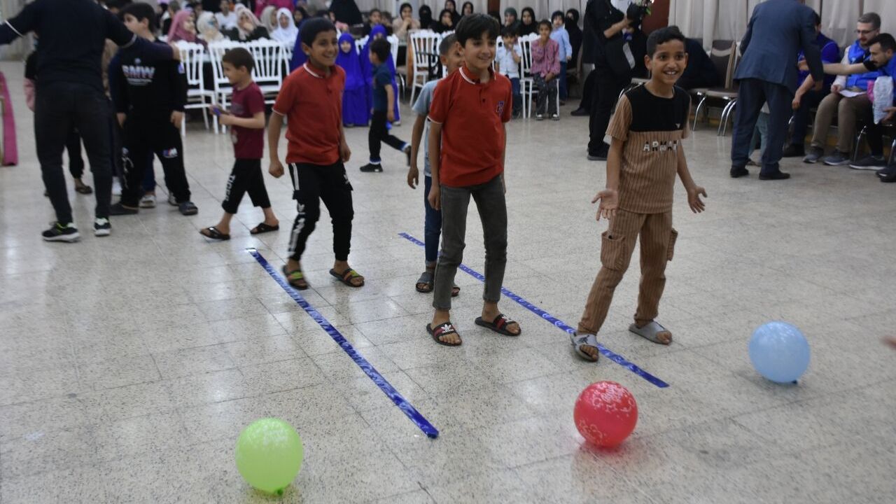 Kerkük kent merkezindeki Musalla Spor Merkezi salonunda yetim ve ailesine yönelik düzenlenen program kapsamında çocuklar, Kerkük'te ramazana özel oyun gösterisi, müsabaka, bilgi yarışması ve çeşitli etkinliklerde gönüllerince eğlendi.