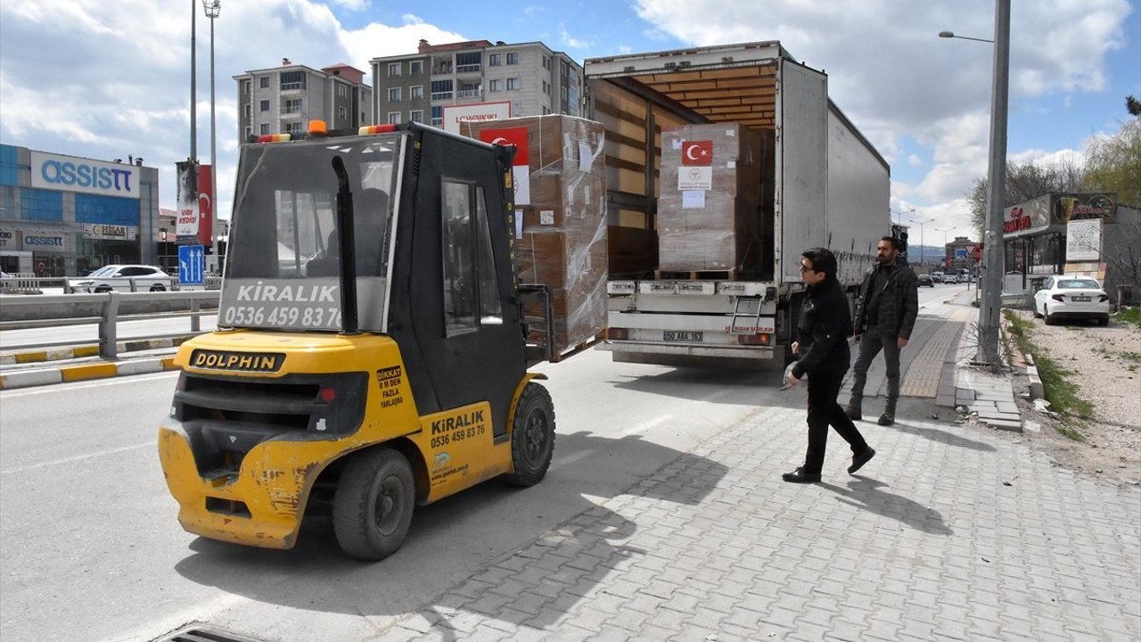 Burada hazırlanan yardım malzemeleri, İl Sağlık Müdürlüğü personelince tırlara yüklendi.