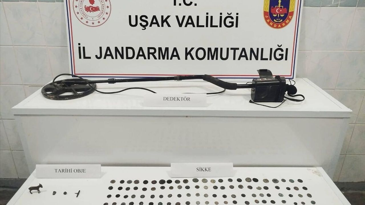 UŞAK (AA) - Uşak'ta bir evde farklı dönemlere ait 161 sikke ve 7 tarihi obje ele geçirildi.