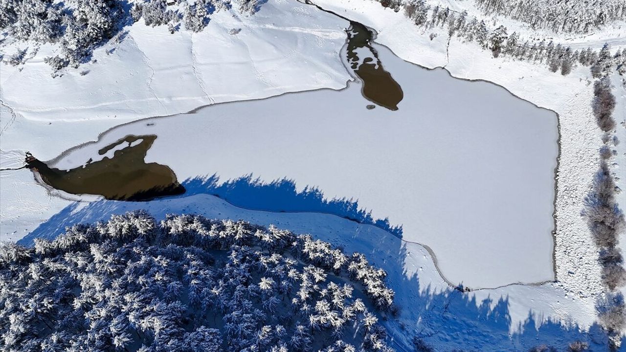 Banaz ilçesinde kar yağışıyla beyaza bürünen karaçam ormanlarının arasında bulunan Baltalı Göleti ayrı güzelliğe büründü.