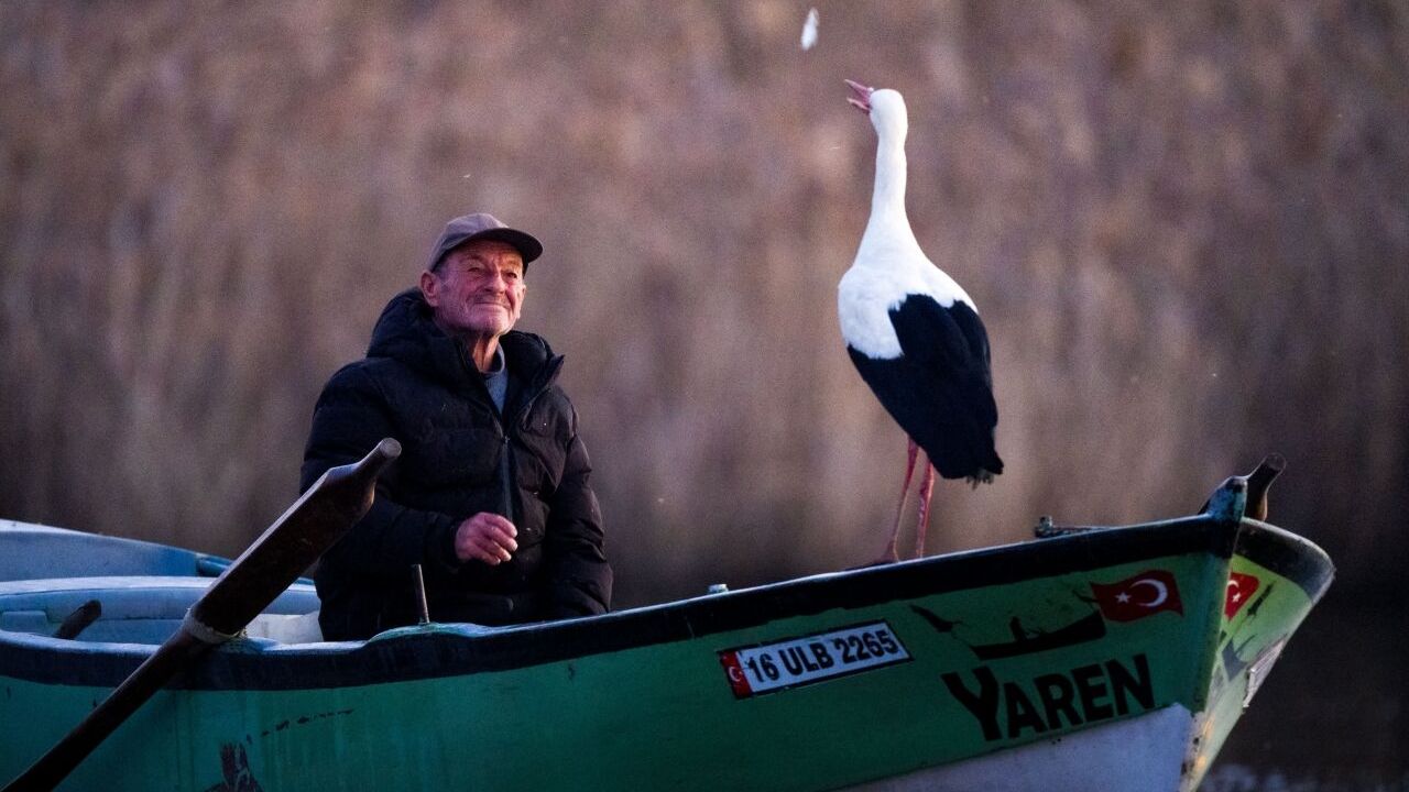 Yaren leyleğin, göl manzaralı yuvasının bulunduğu mahallede balıkçı Yılmaz'ın kayığındaki "geleneksel" pozu, doğa ve yaban hayatı fotoğrafçısı Alper Tüydeş tarafından kayda alındı.