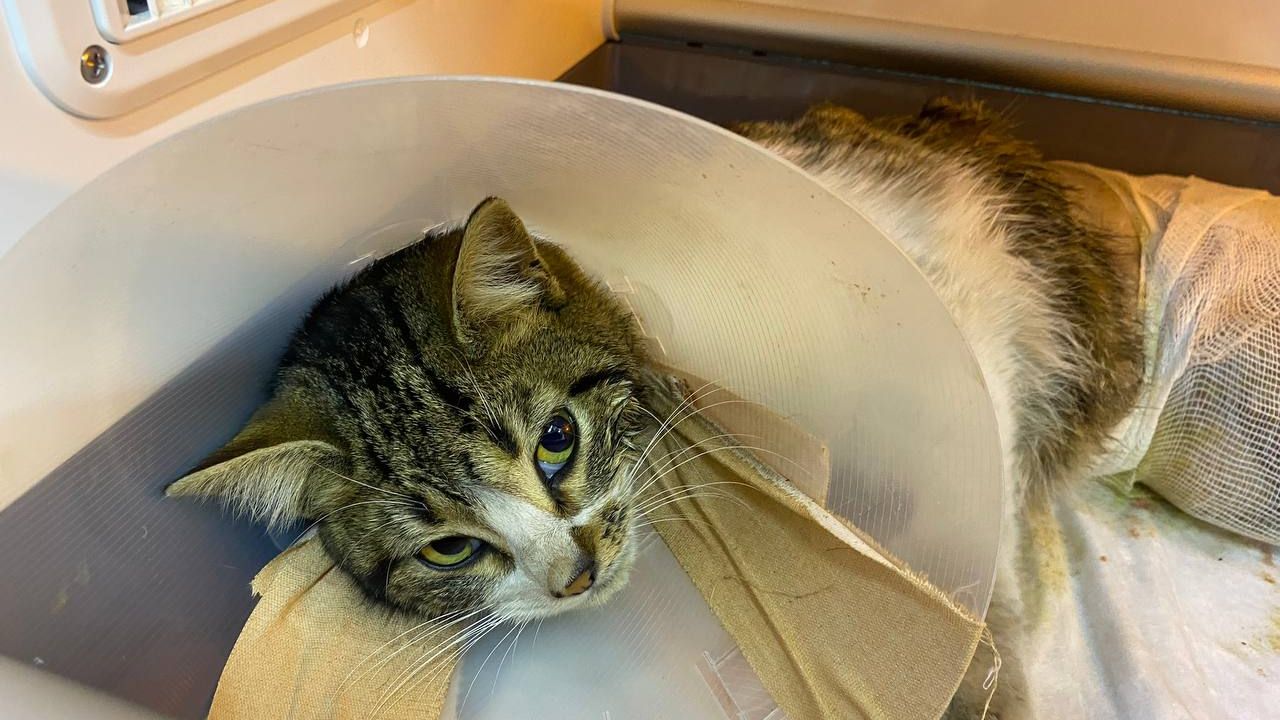 "Diren" adı verilen ve yoğun bakımda tedavisine başlanan kedinin bir patisi ile kuyruğu ampute edildi.
